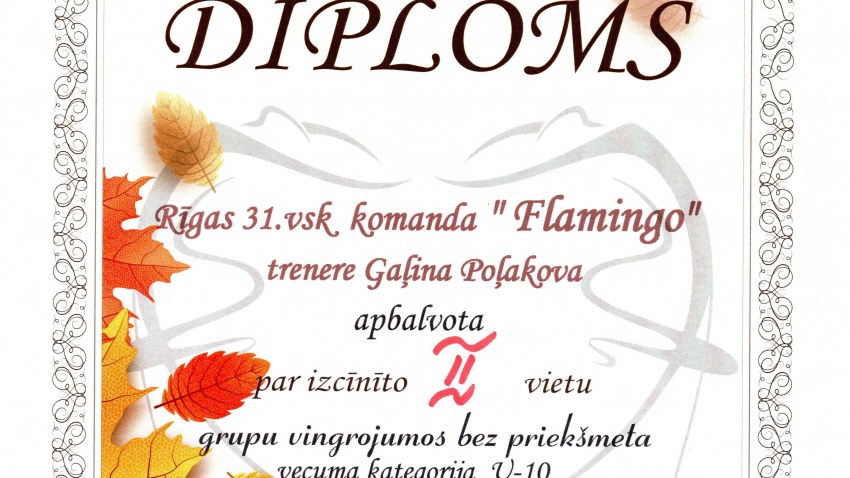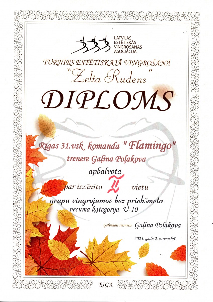 Mākslas un ritmiskās vingrošanas pulciņš 2. novembrī veiksmīgi piedalījiās turnīrā "Zelta Rudens", vecuma kategorijā 8-10 gadi iegūstot 2. vietu!